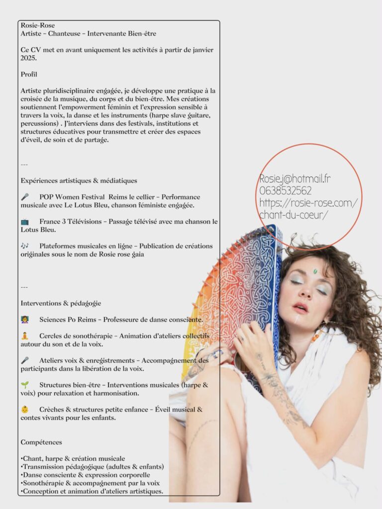 Je m’appelle Rose Rose, je suis artiste de 33 ans, et je vis en Champagne-Ardenne, près de Reims. Je me définis comme une artiste entière, à la frontière de l’art et du bien-être, où la création devient un espace de transformation, de soin et de reliance. Mon travail est profondément inspiré par la nature, ses cycles, ses rythmes et son intelligence vivante. À travers l’art, je questionne notre manière de vivre, d’habiter nos corps et notre quotidien, et j’ouvre des espaces pour explorer une authenticité plus alignée, en accord avec notre propre nature intérieure. J’œuvre au bien-être à travers des formes artistiques multiples et complémentaires : peinture, body painting, tatouage, musique, danse consciente et voyages sonores. J’organise des retraites immersives et des événements saisonniers, pensés comme des rituels contemporains, invitant à se sentir en lien avec les saisons, le corps et le vivant. Je suis actuellement en création d’un spectacle vivant, mêlant composition musicale et danse, en co-création avec une danseuse, où le corps devient langage, mémoire et vibration. J’accompagne également des personnes en coaching individuel, où l’art devient un outil thérapeutique, un espace d’écoute profonde, de transformation et de recentrage. En parallèle, j’interviens comme prêtresse de cérémonie, notamment pour les mariages, en créant des rituels sur mesure, symboliques et incarnés, ancrés dans le sens, la présence et l’émotion. Mon travail s’adresse à tous les âges et tous les publics : je suis professeure de danse consciente à Sciences Po Reims, j’interviens en crèche à travers des éveils musicaux et des contes pour les enfants, et également en EHPAD, où la musique, le mouvement et la présence deviennent des passerelles de lien et de mémoire. Pour moi, l’art est une clé essentielle de la guérison de l’humanité, lorsqu’il est porté avec conscience, intention et ouverture thérapeutique. Mon œuvre pose une question centrale : comment vivre avec plus de justesse, de lenteur et d’authenticité, en respectant nos cycles intérieurs et ceux du vivant ? Je crée des espaces pour ressentir, se souvenir, et réapprendre à être — ensemble.
